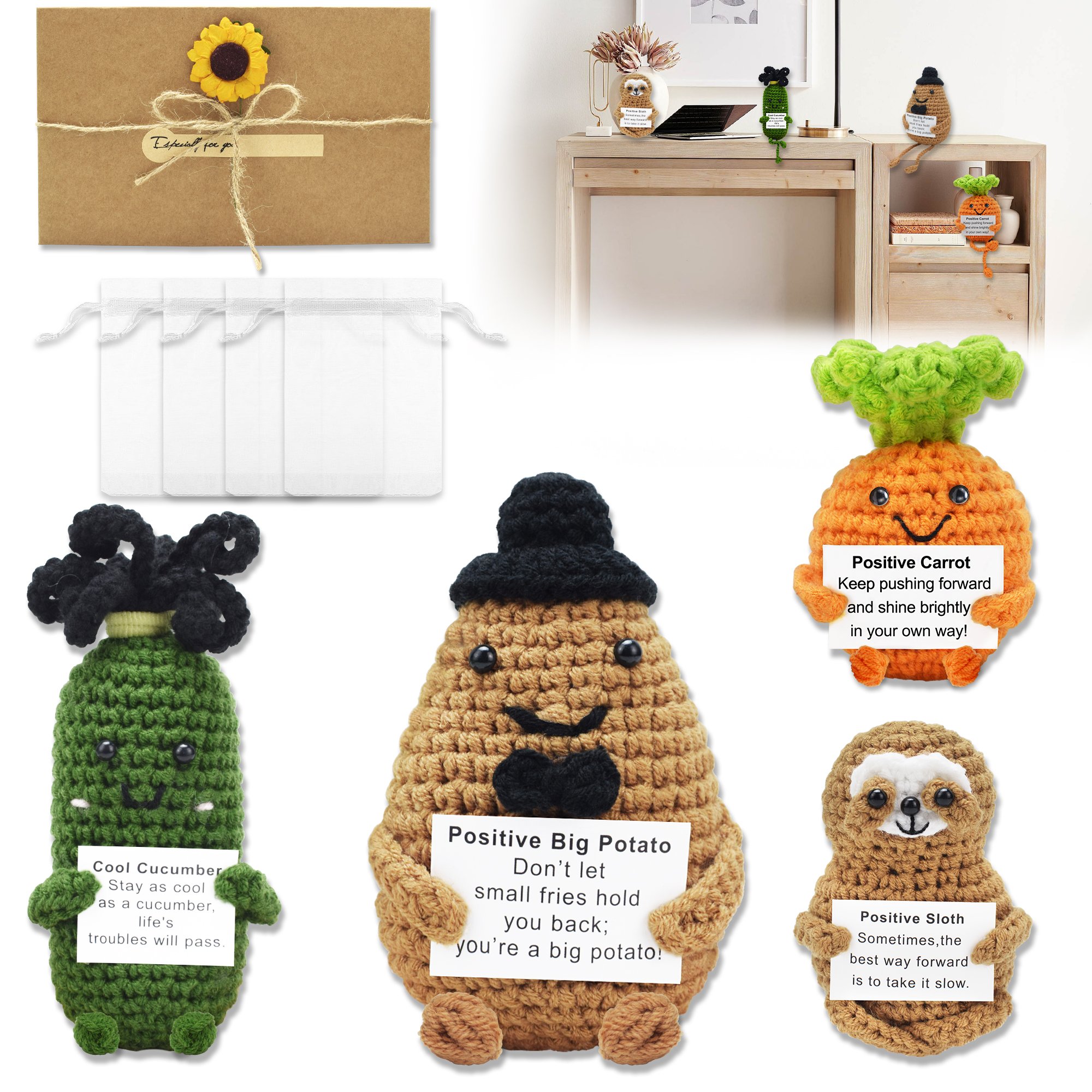 Positive Big Potato Emotional Support Pickle Positive Crochet Animals Vegetables with Note, for Women Teacher Coworker Friend Family,Suitable for Home Office Decorations(4pcs )